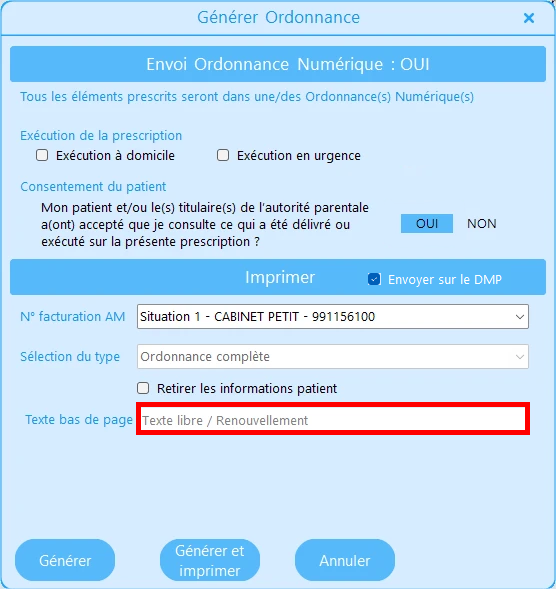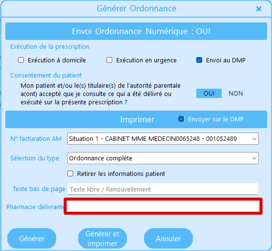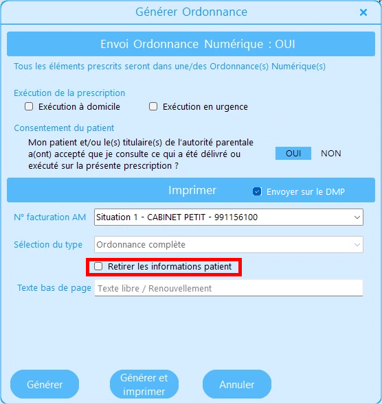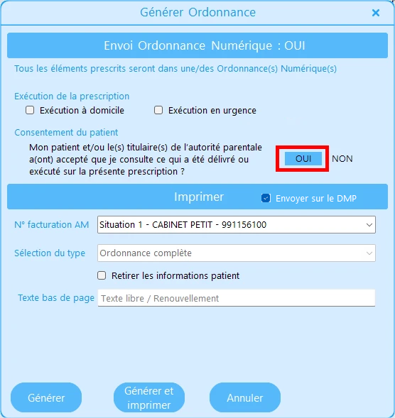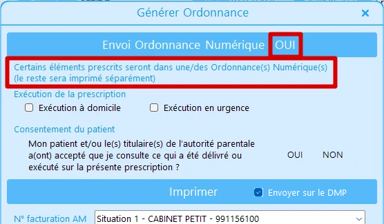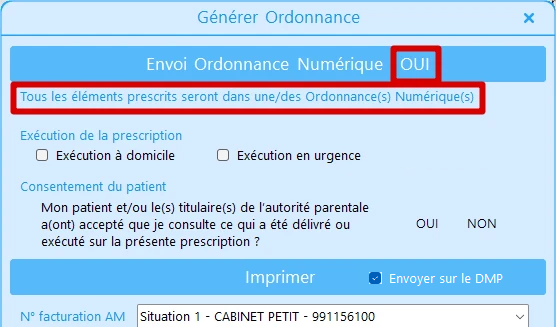 • Envoi au DMP (case cochée par défaut pour l'ordonnance numérique)