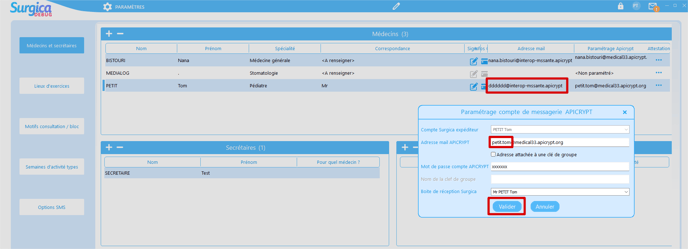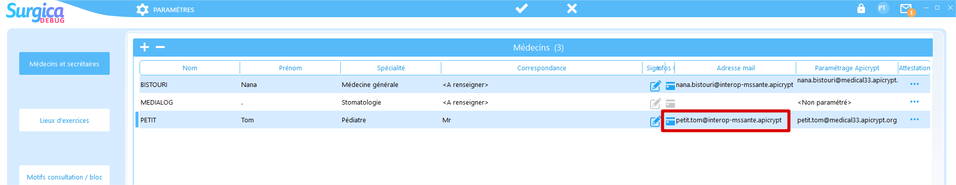 - Dans l'onglet "Médecins et secrétaires", repérer votre nom dans le tableau "Médecins", puis cliquer dans le champ "Paramétrage Apicrypt" correspondant à votre ligne.