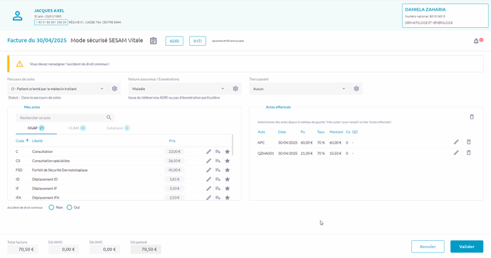 6. Ecran de saisie : modifier ou compléter si besoin avant de valider (exemple : ajout TP AMO, exonération, etc...)