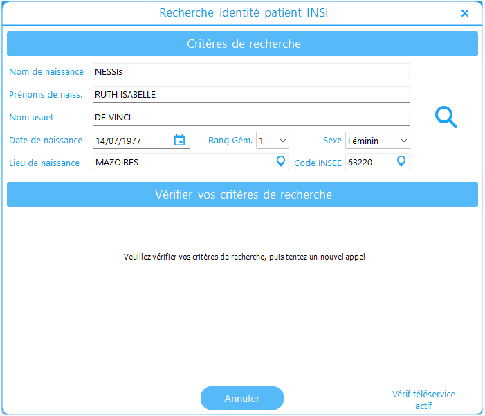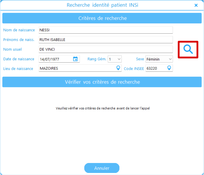 Au niveau de l'écran de recherche, on peut contrôler l’identité du patient et vérifier s'il corresponde aux informations du dossier patient. Et si ce n'est pas le cas les corriger ci-dessous