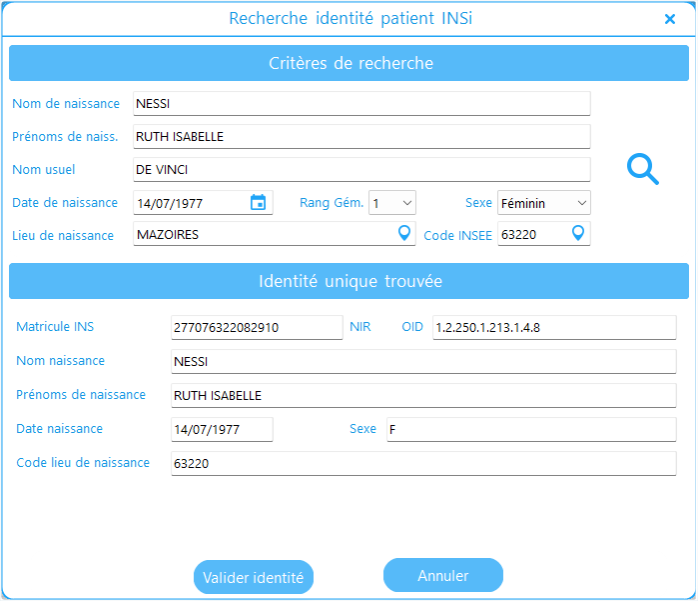 Si l’identité retournée par le téléservice correspond au patient, cliquer sur Valider identité.