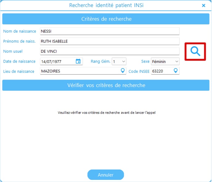 Permet de faire une identification du patient via les traits d’identités renseignés sur sa fiche identité (Critères de recherche sur la capture d'écran ci dessous)