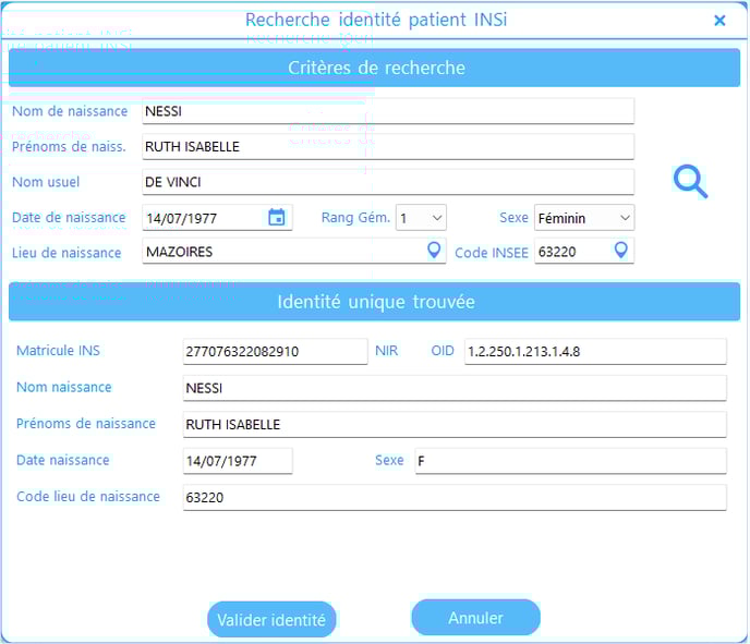 Si l’identité retournée par le téléservice correspond au patient, cliquer sur Valider identité. L’écran INS affiche les informations retenues et la date de validité de ces dernières.