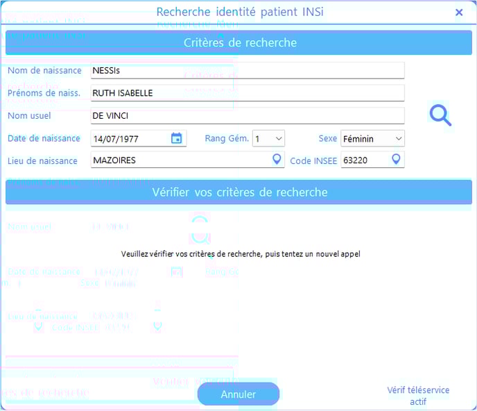 Après le lancement du téléservice, comme pour la recherche avec vitale, si l’identité retournée par le téléservice correspond au patient, cliquez sur Valider l’identité