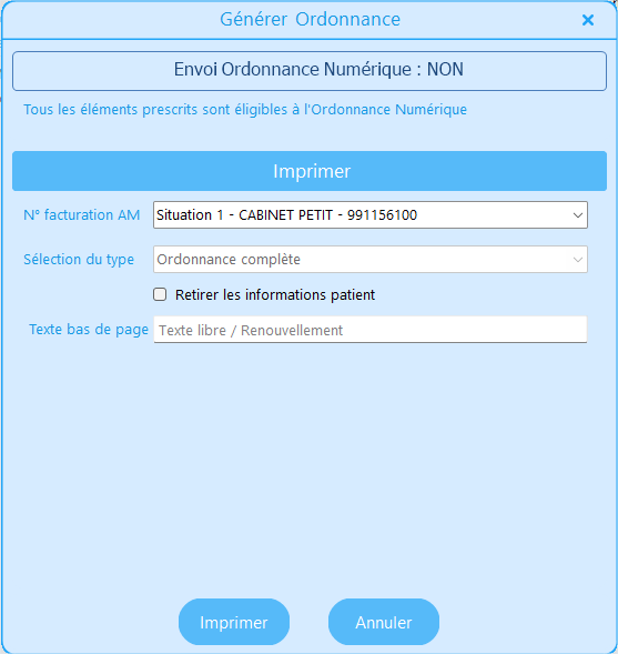 En fermant l’analyse, on accède à l’écran suivant qui permet d’imprimer l’ordonnance et éventuellement de l’envoyer au format numérique.