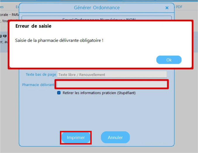 Lors de la génération de l’ordonnance, la saisie de la “Pharmacie délivrante” est obligatoire